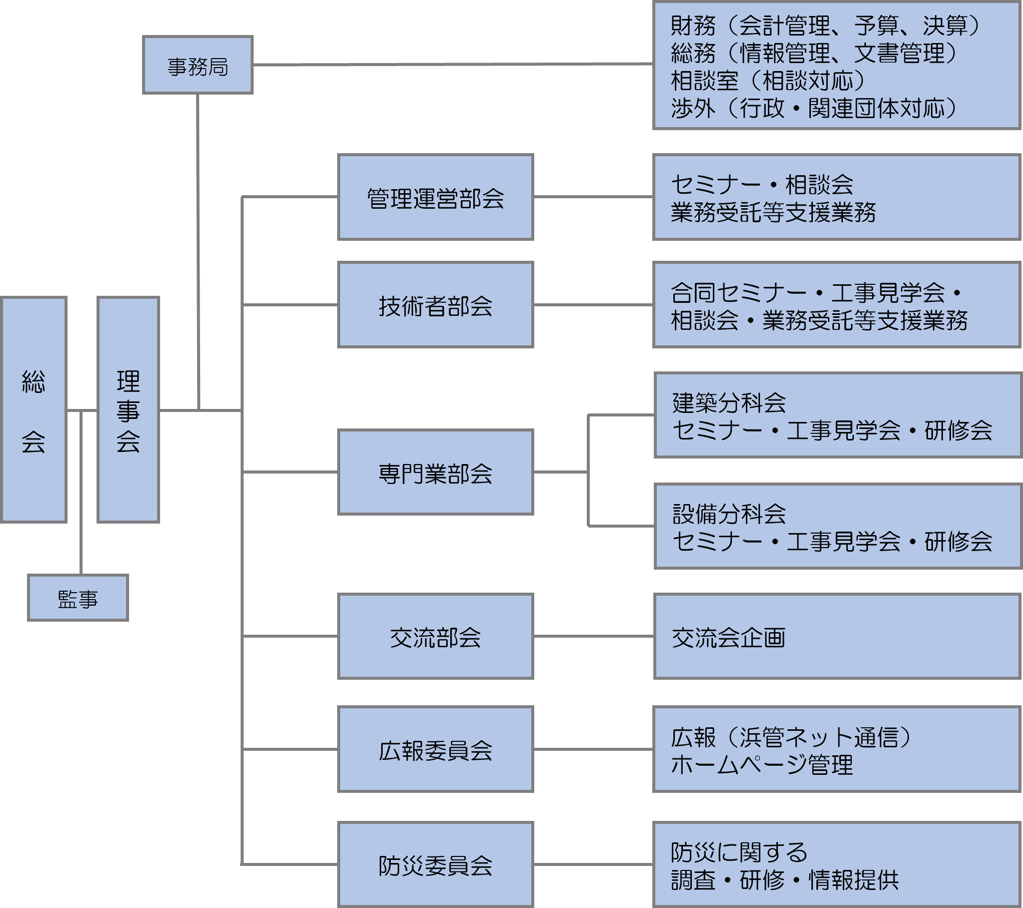 浜管ネット専門部会は、横浜マンション管理組合ネットワークの賛助会員で構成されており、組織として幹事会(部会長・副部会長・幹事)建築分科会(A、B、C、D、Eグループ)・設備分会(設備分科会長・A、Bグループ)で組織構成されており、主な活動は以下のようなものです。